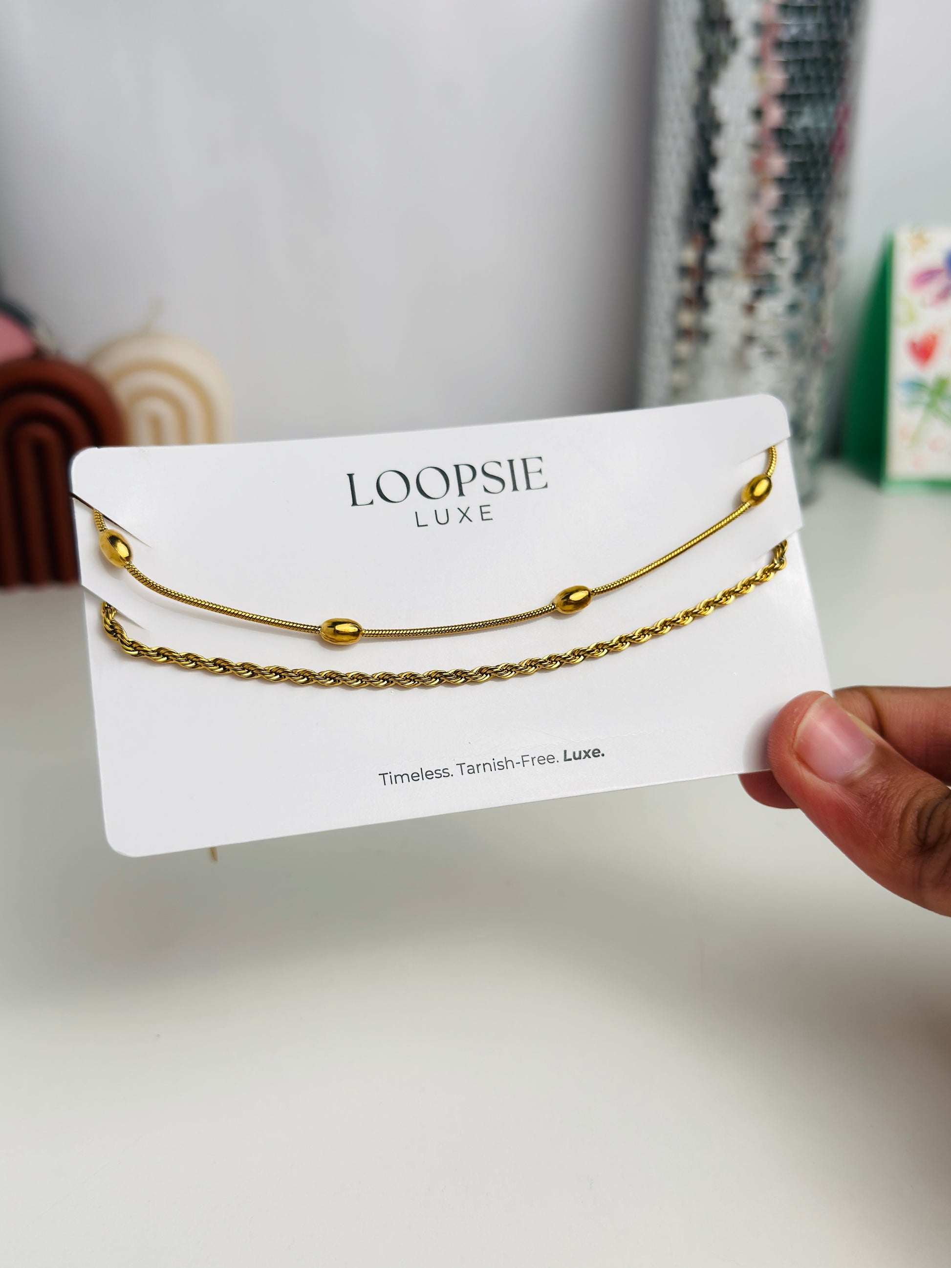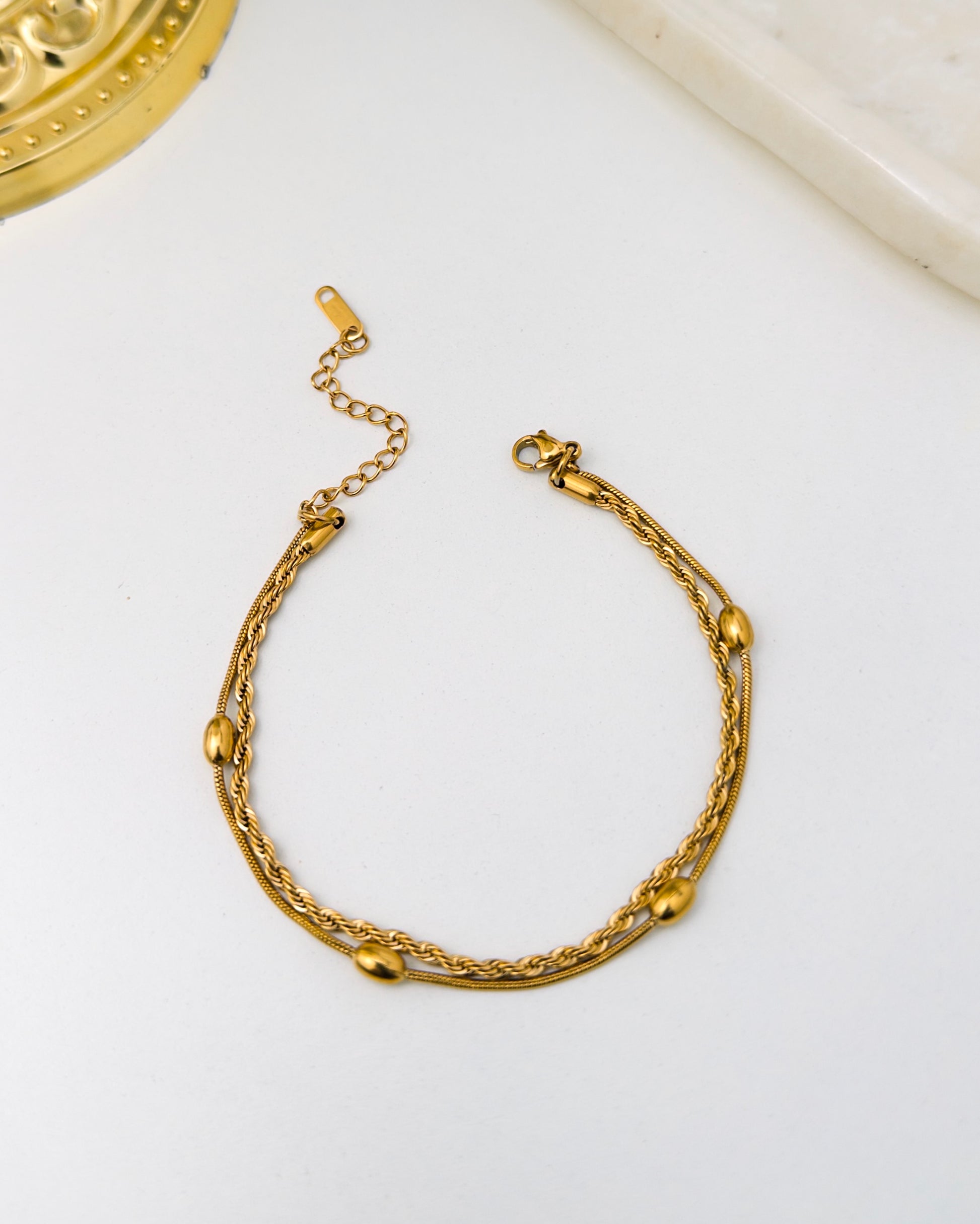 A refined double-strand bracelet designed for effortless everyday luxury. The contrast of a sleek bead-detailed snake chain with a textured rope chain creates a balanced, elevated look that works beautifully solo or stacked.