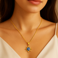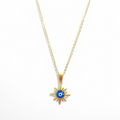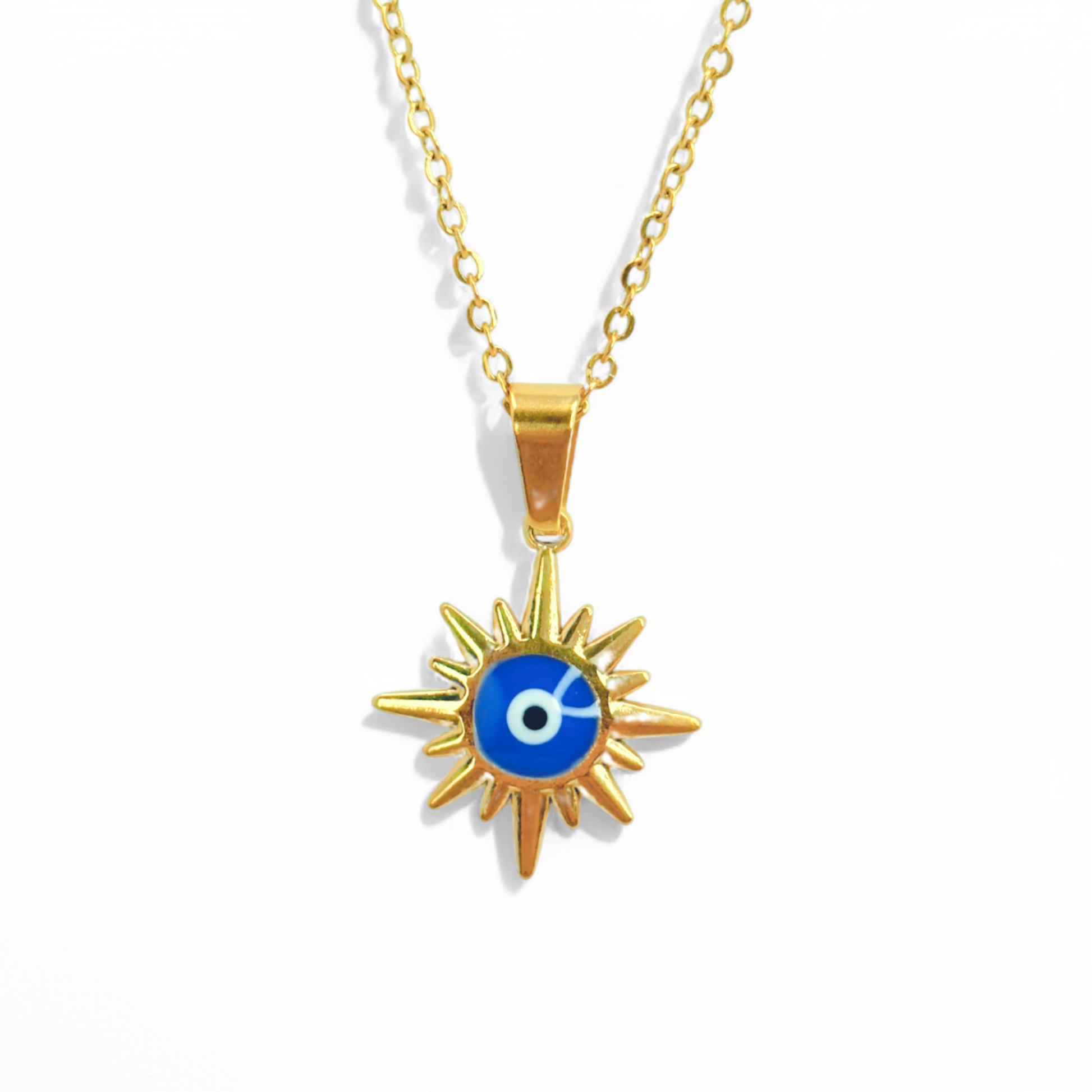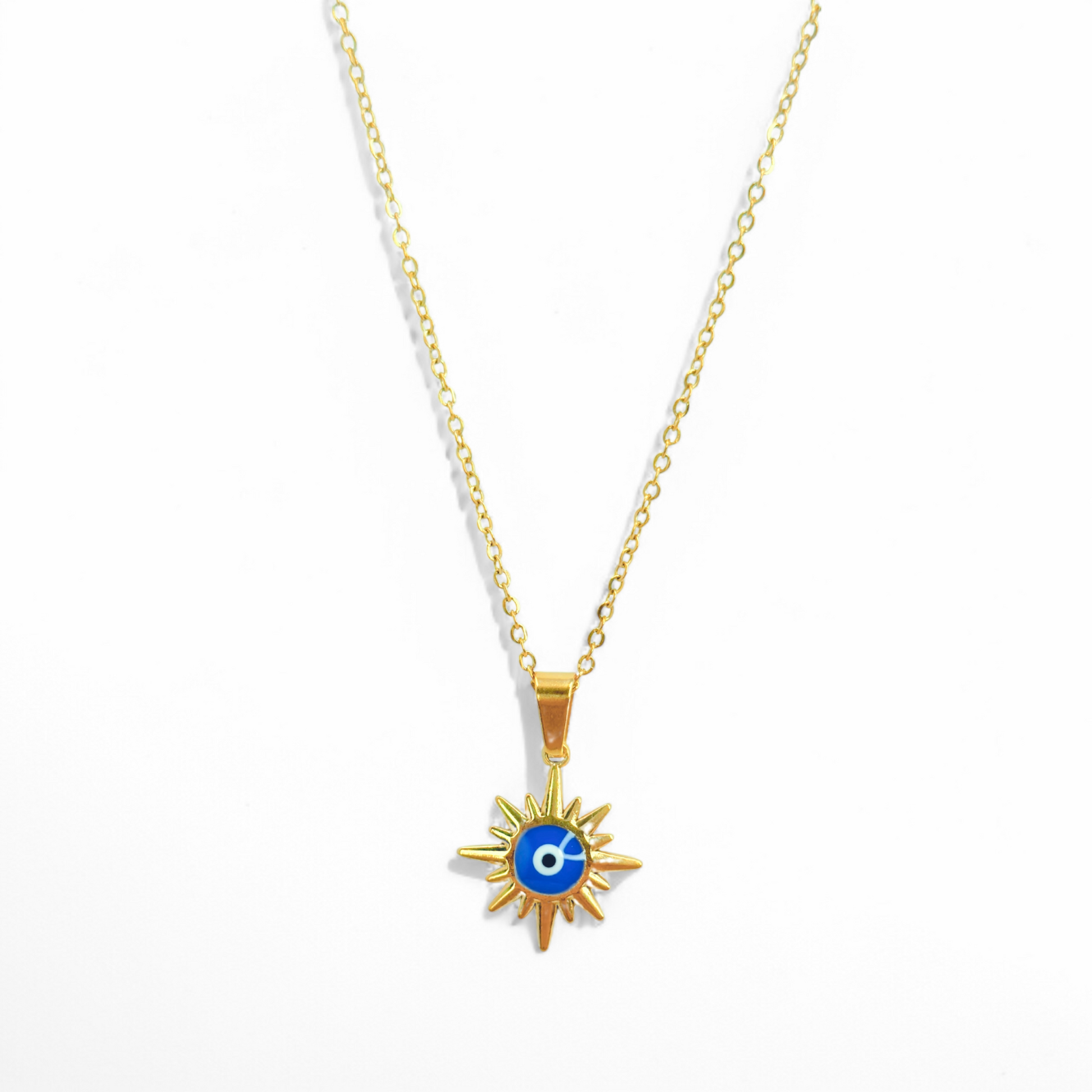 A radiant symbol of protection and power, the Solar Gaze Necklace features a striking sunburst pendant with a bold blue evil eye center, crafted to reflect strength, light, and energy. Equal parts fashion and meaning, this piece blends tradition with modern shine.