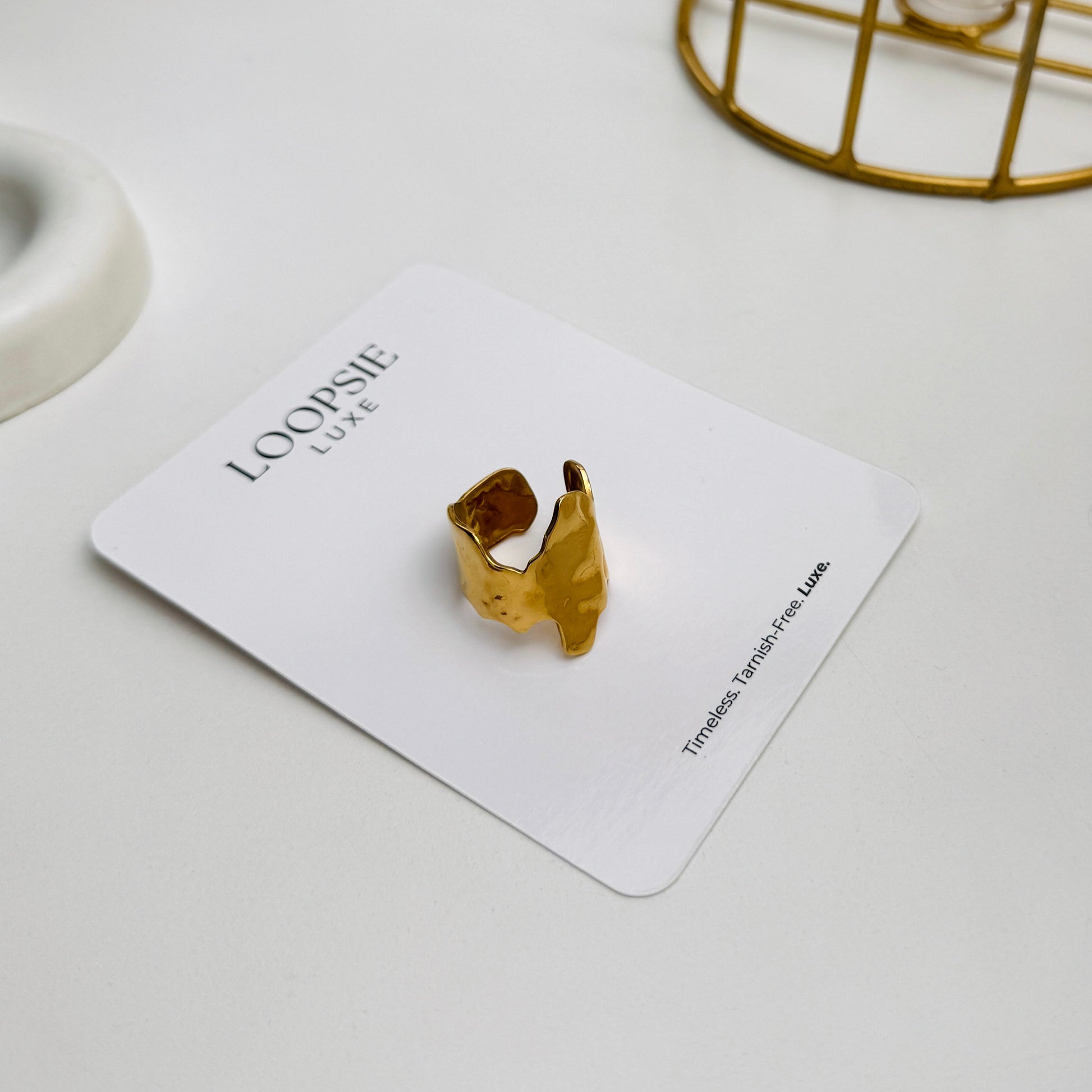 The Aurum Drift Ring mirrors the flow of molten gold β irregular, sculptural, and effortlessly striking. Its raw finish reflects light in unexpected ways, making each angle a story of its own.