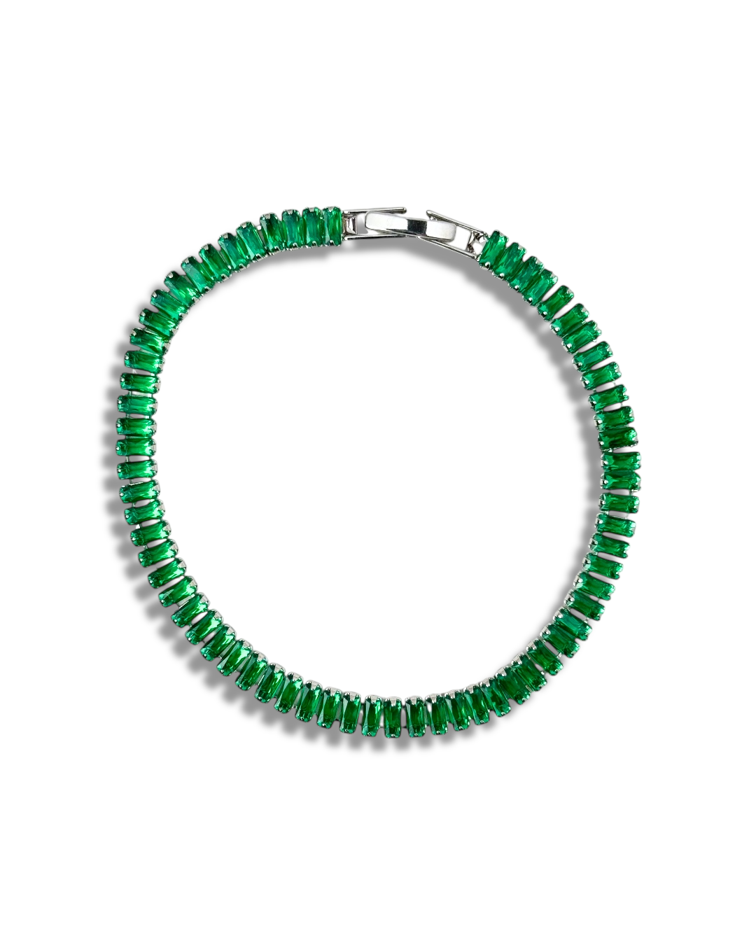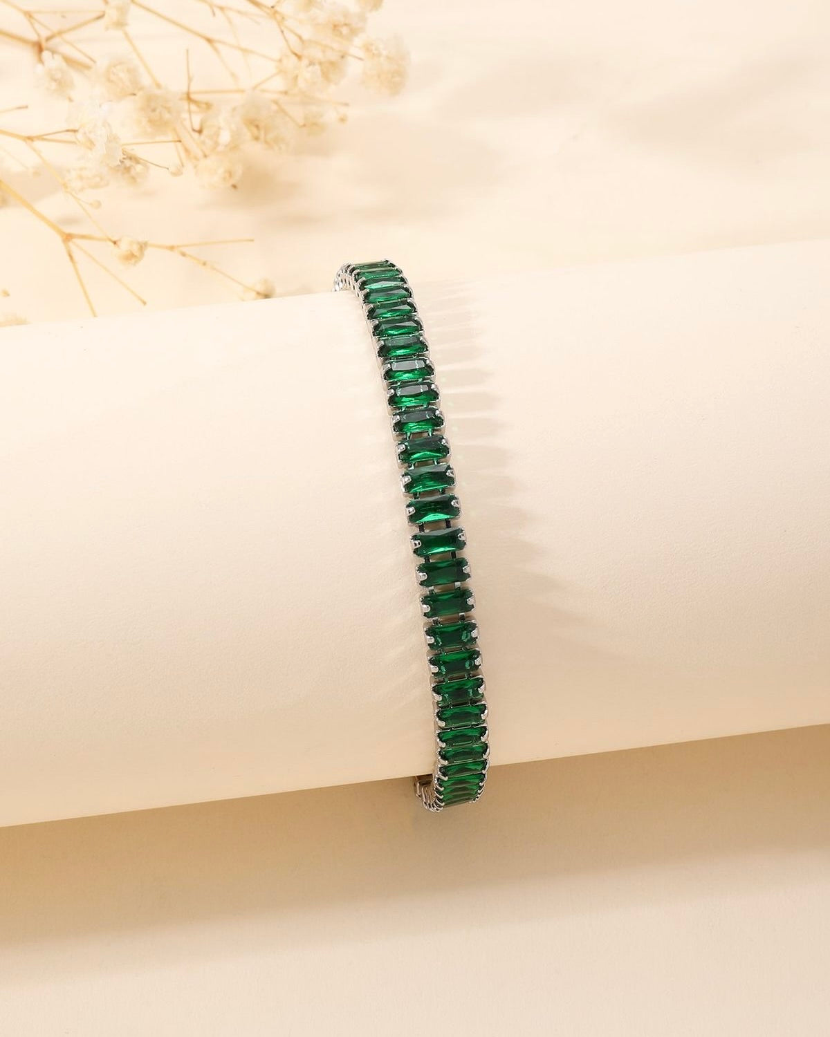A sleek emerald green tennis bracelet featuring baguette-cut stones for a modern yet timeless finish.