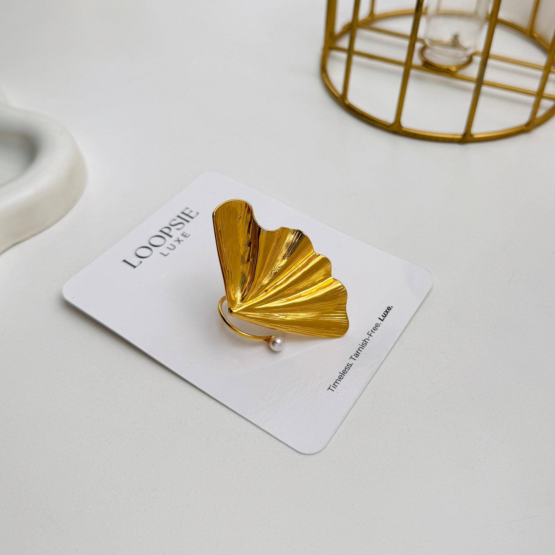 The Gilded Fan Pearl Ring is inspired by the grace of vintage hand fans β a bold, sculpted gold design paired with a dainty pearl detail. Its curved ridges catch light effortlessly, making it a true wearable sculpture for your hand.