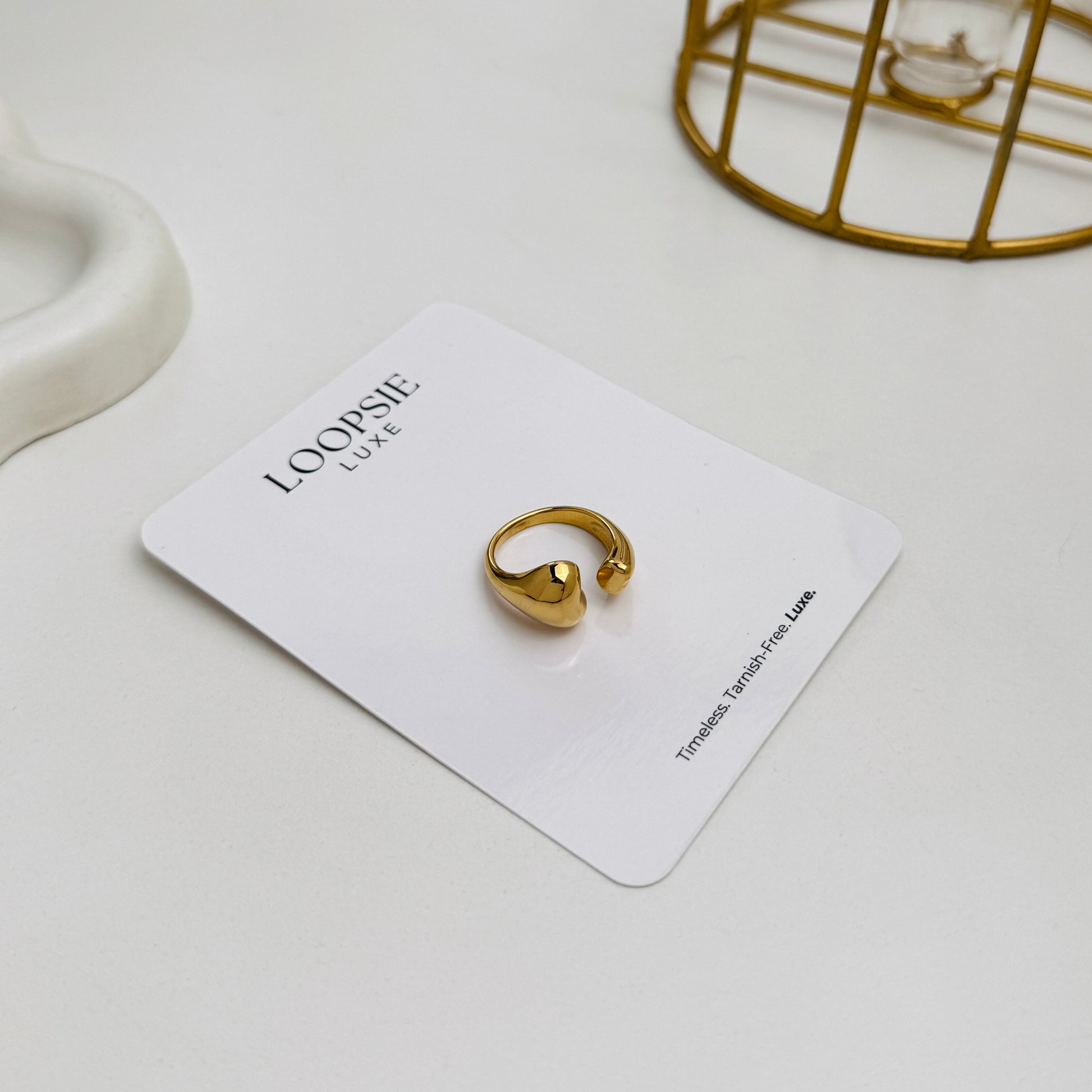 The Golden Heartloop Ring is a minimalist open-ended ring featuring a raised puff heart on one end and a sleek gold curve on the other. Designed to hug your finger in the gentlest embrace, it blends bold shape with soft sentiment.