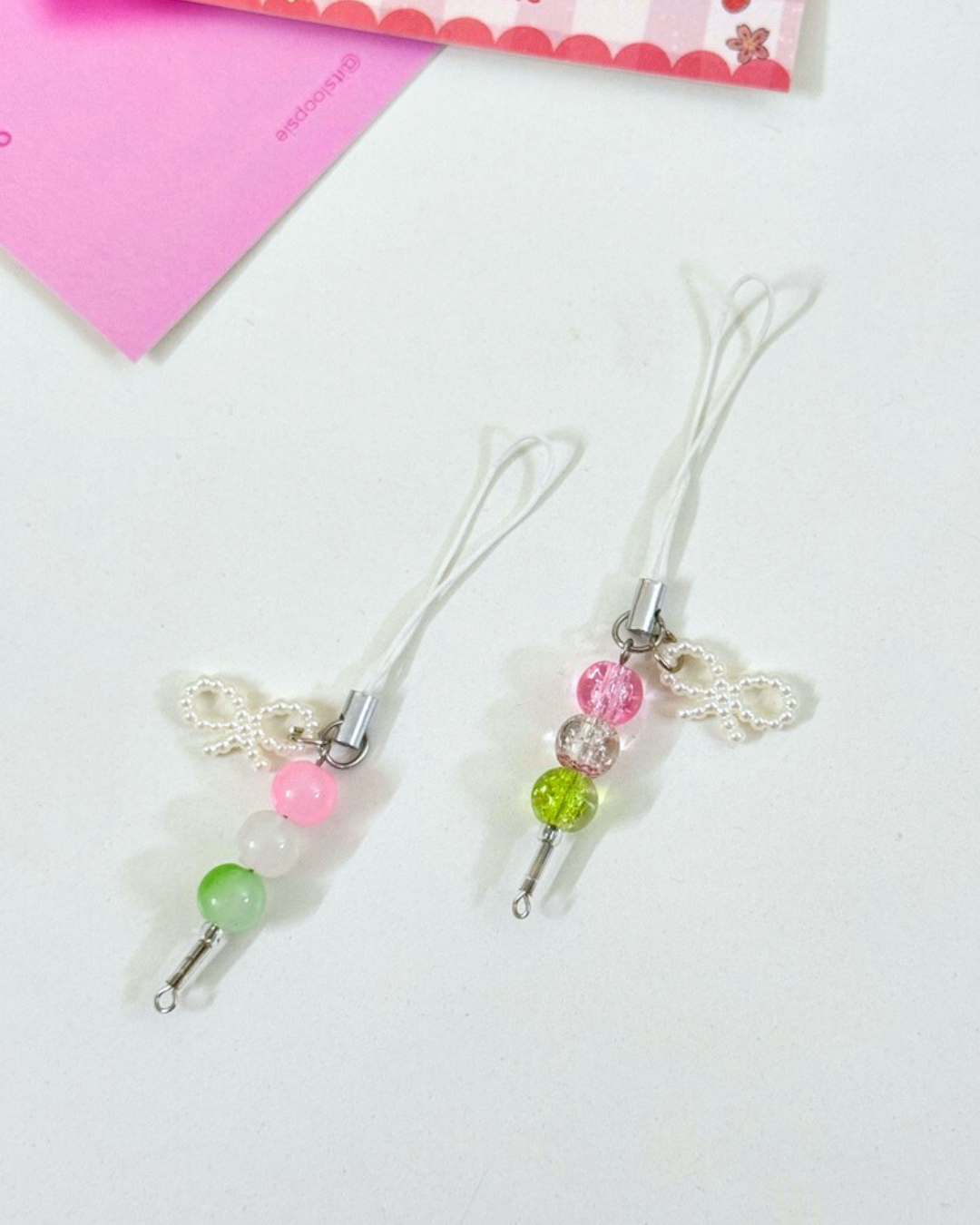 A pastel-inspired charm duo featuring soft bead stacks that resemble adorable dango treats. Playful, colorful, and perfect for adding a kawaii touch to your essentials.
