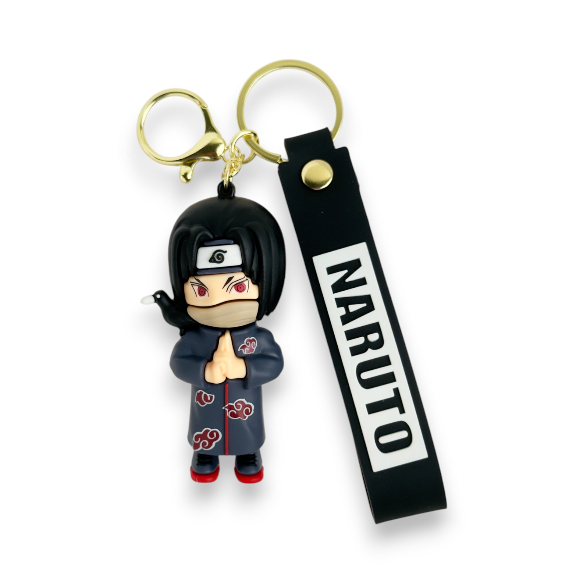Step into the shadows with the legendary rogue ninja—Itachi Uchiha. This chibi-style keychain captures Itachi in his Akatsuki cloak, performing a classic jutsu with his Sharingan eyes glowing red. Complete with a black "NARUTO" strap and a perched crow on his shoulder, this keychain is a collector's dream.