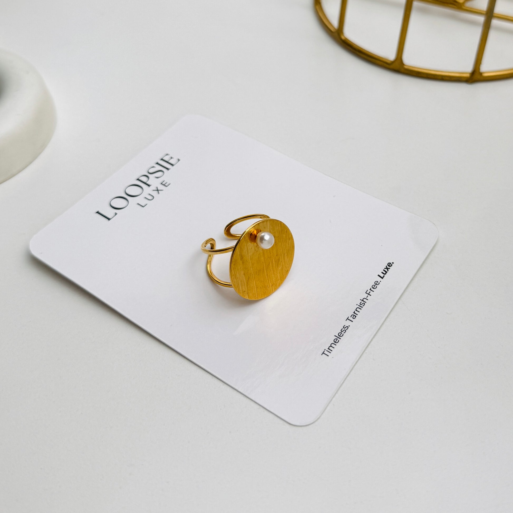 The Luna Disc Pearl Ring pairs sculptural simplicity with celestial charm. Featuring a softly brushed golden disc and a dainty faux pearl delicately set on its edge, this ring is designed for the modern muse who loves quiet luxury.