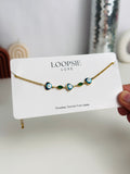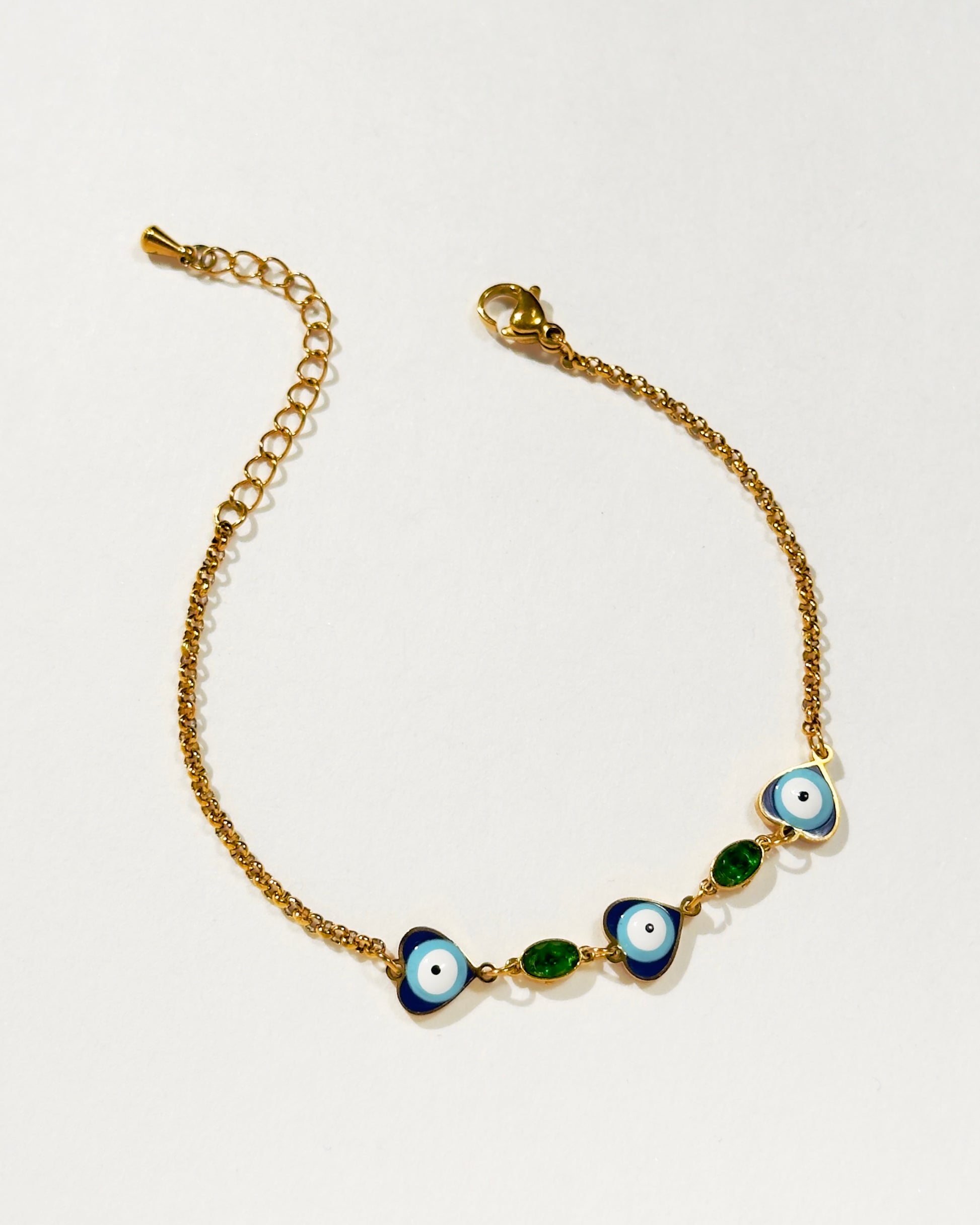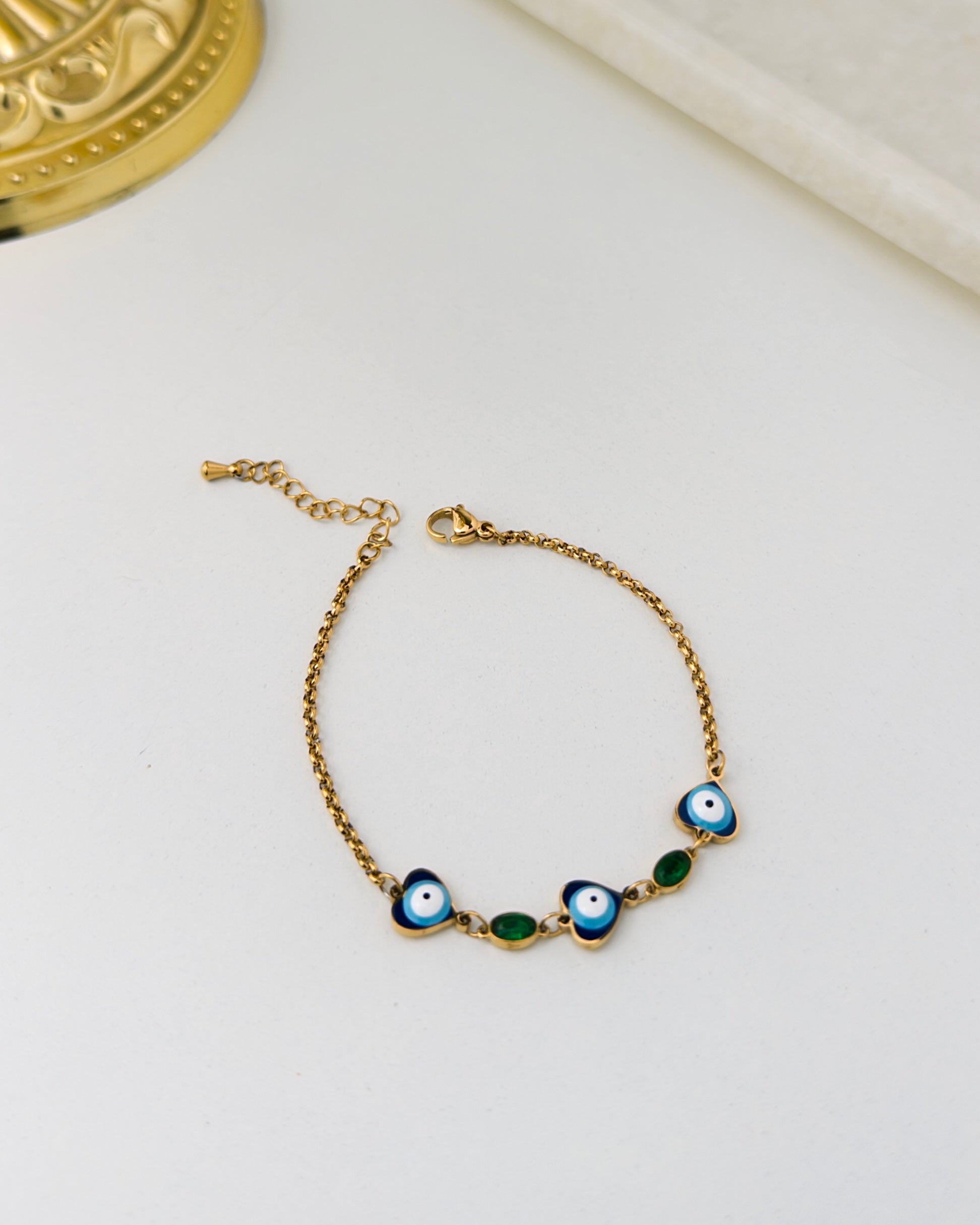 A sleek and minimal evil eye bracelet designed with petite charms and subtle green accents. Perfect for everyday wear without overpowering your look.