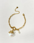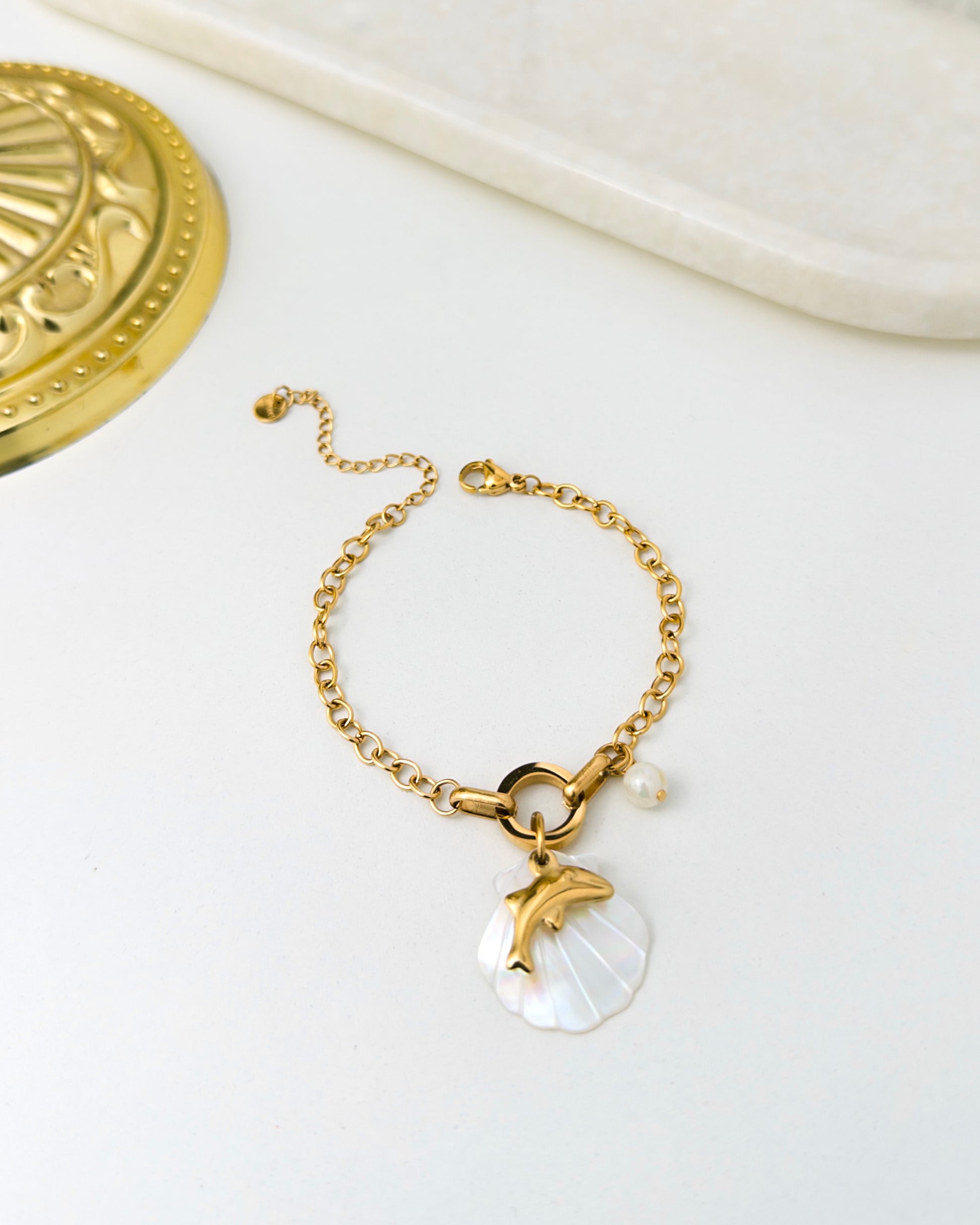 A playful yet elegant charm bracelet featuring a pearl shell base, dolphin motif and soft pearl accent. Designed for those who love ocean-inspired jewellery with a luxe finish.