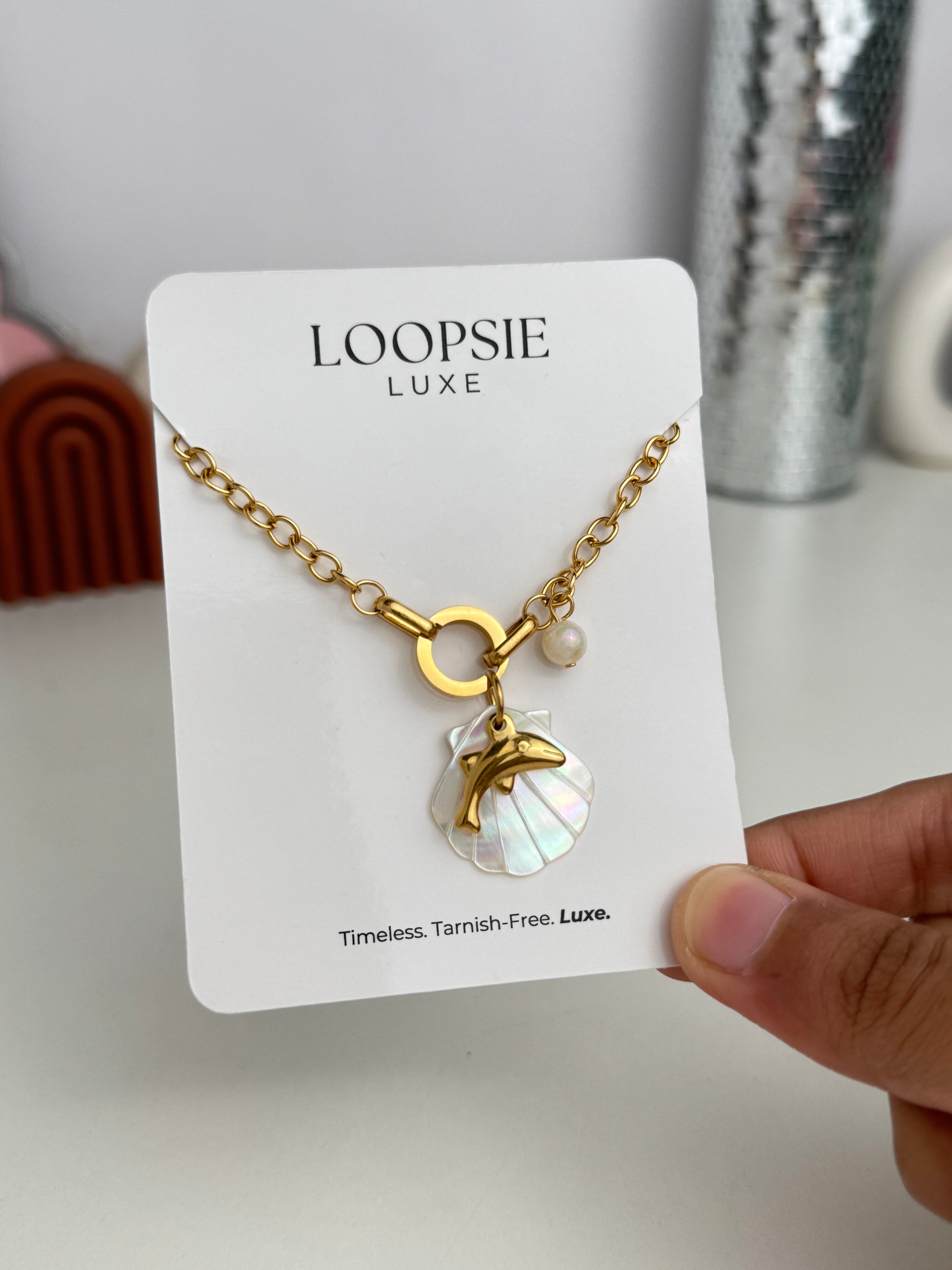 - Pearl shell and dolphin charm detailing