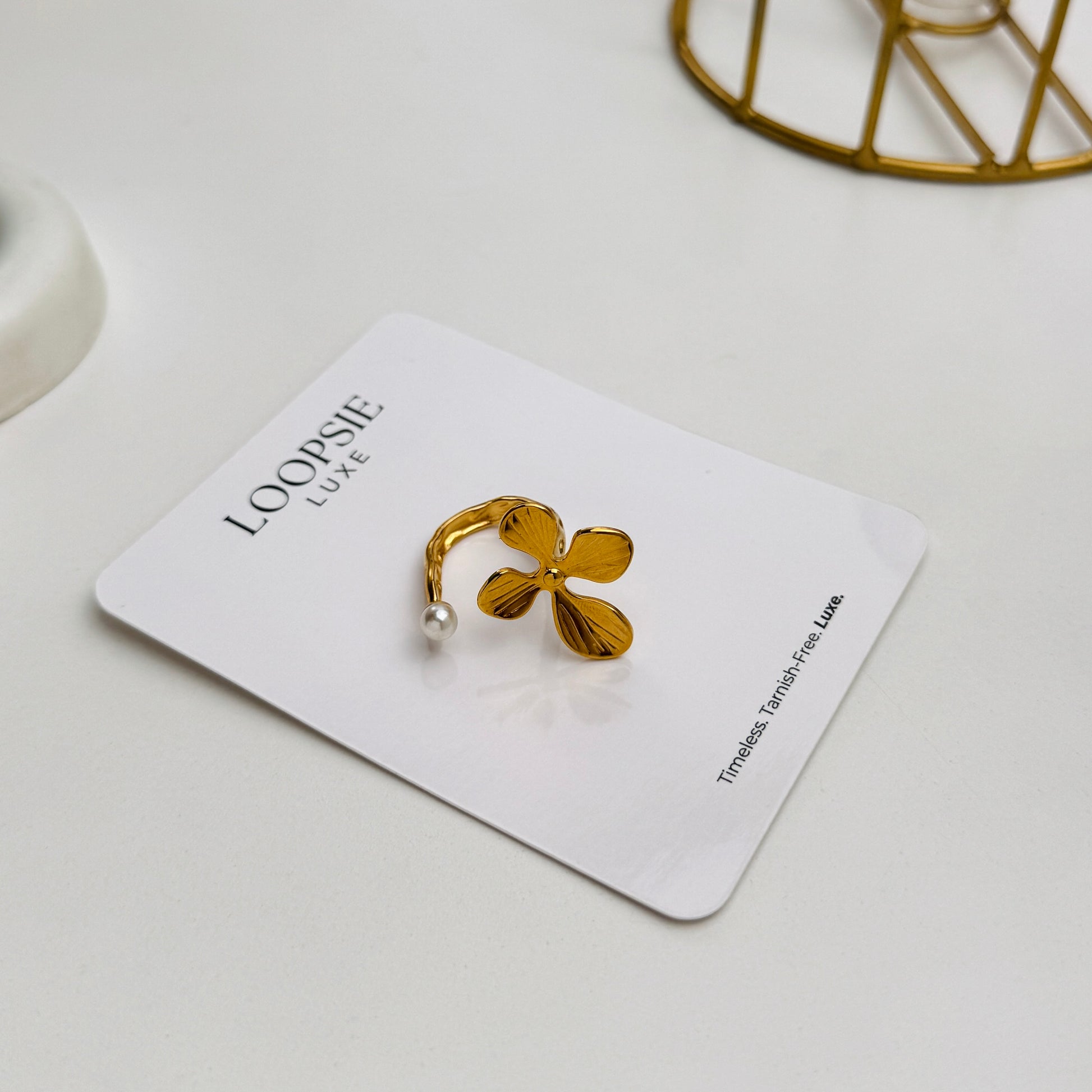 Delicate yet daring, the Meadow Belle Bloom Ring captures the softness of a wildflower in full bloom. Sculpted in a radiant gold finish with textured petals and a single pearl drop on an open, twisted band β this ring is a nature-loverβs luxury statement.