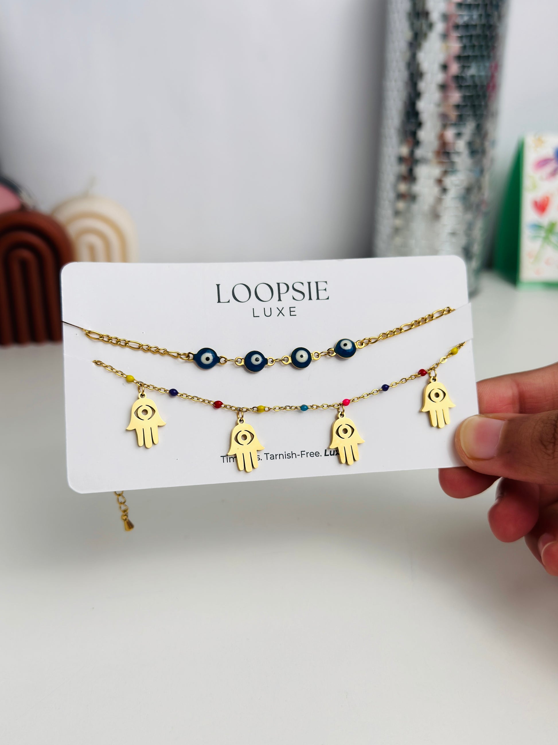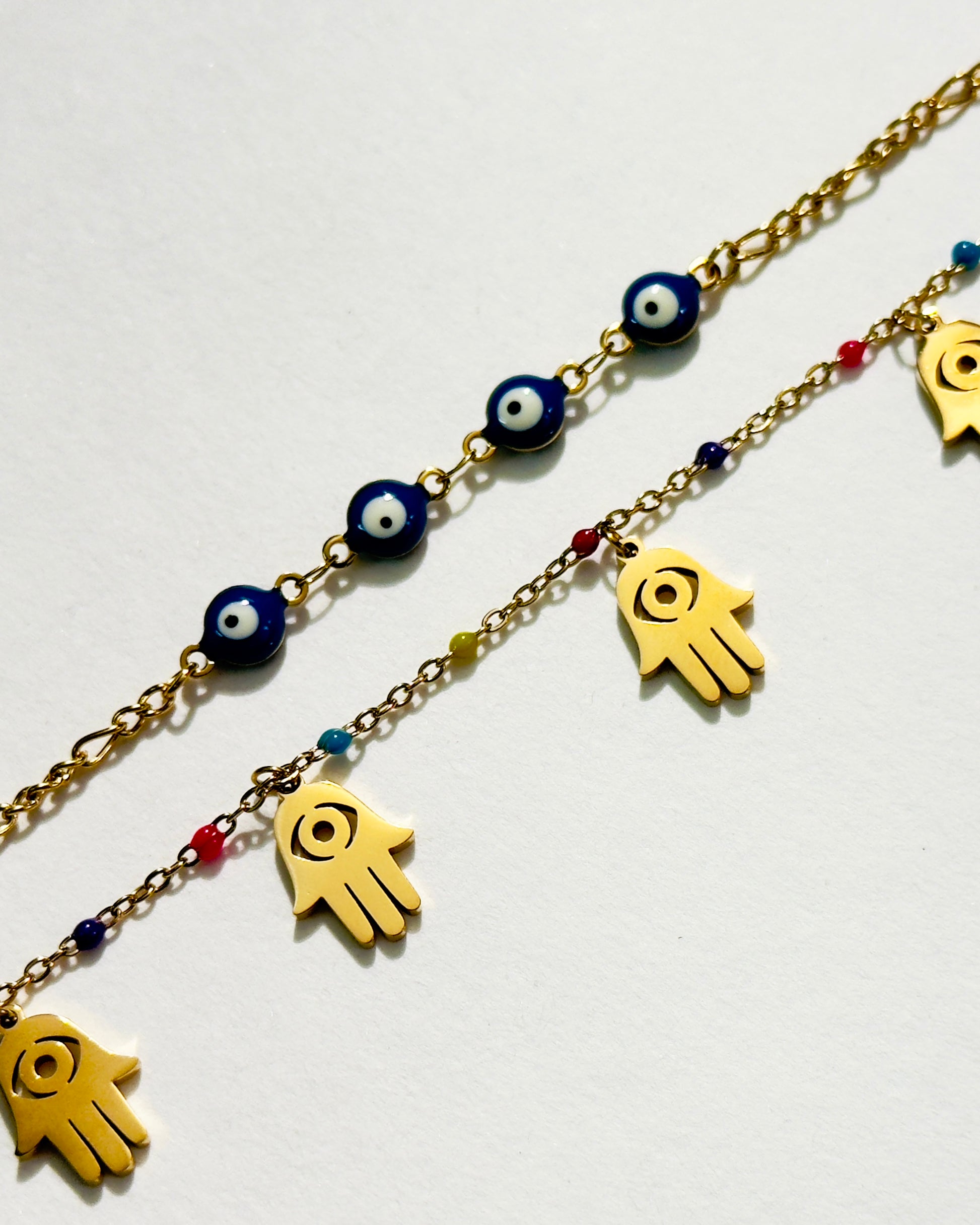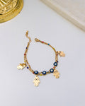 A symbolic bracelet featuring evil eye beads and hamsa hand charms, designed to blend protection with style. Colorful accents add a playful yet meaningful touch.