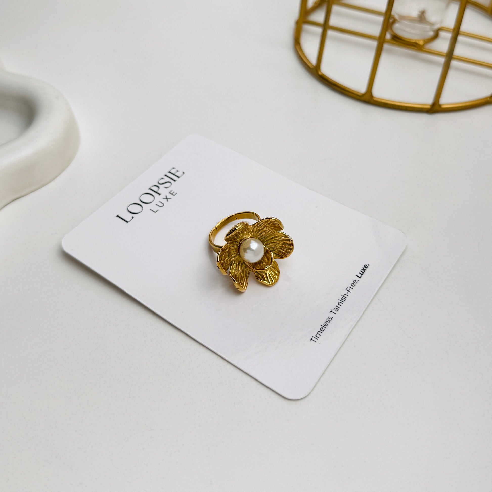 The Petal Muse Pearl Ring blooms in full elegance β featuring a lifelike sculpted floral form in radiant gold, crowned with a luminous faux pearl at the center. Inspired by wild blooms dancing in golden sunlight, it captures the essence of delicate beauty with bold craftsmanship.