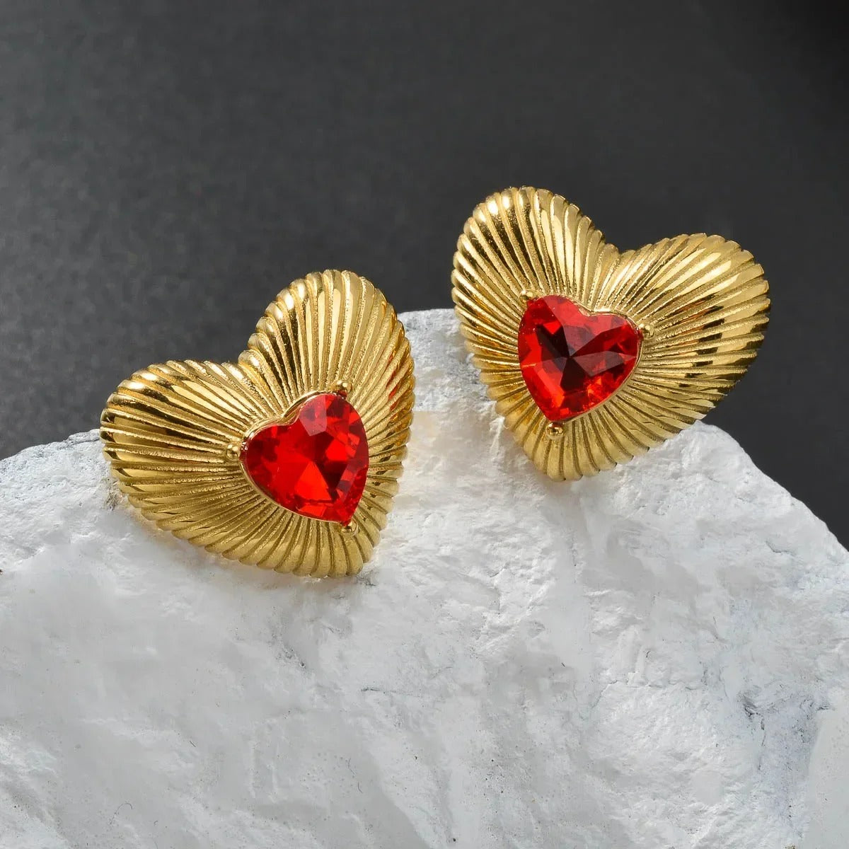 A radiant blend of passion and elegance, the Scarlet Love Studs feature a striking red heart gemstone set in a luxuriously textured gold frame. Designed to make hearts skip a beat.