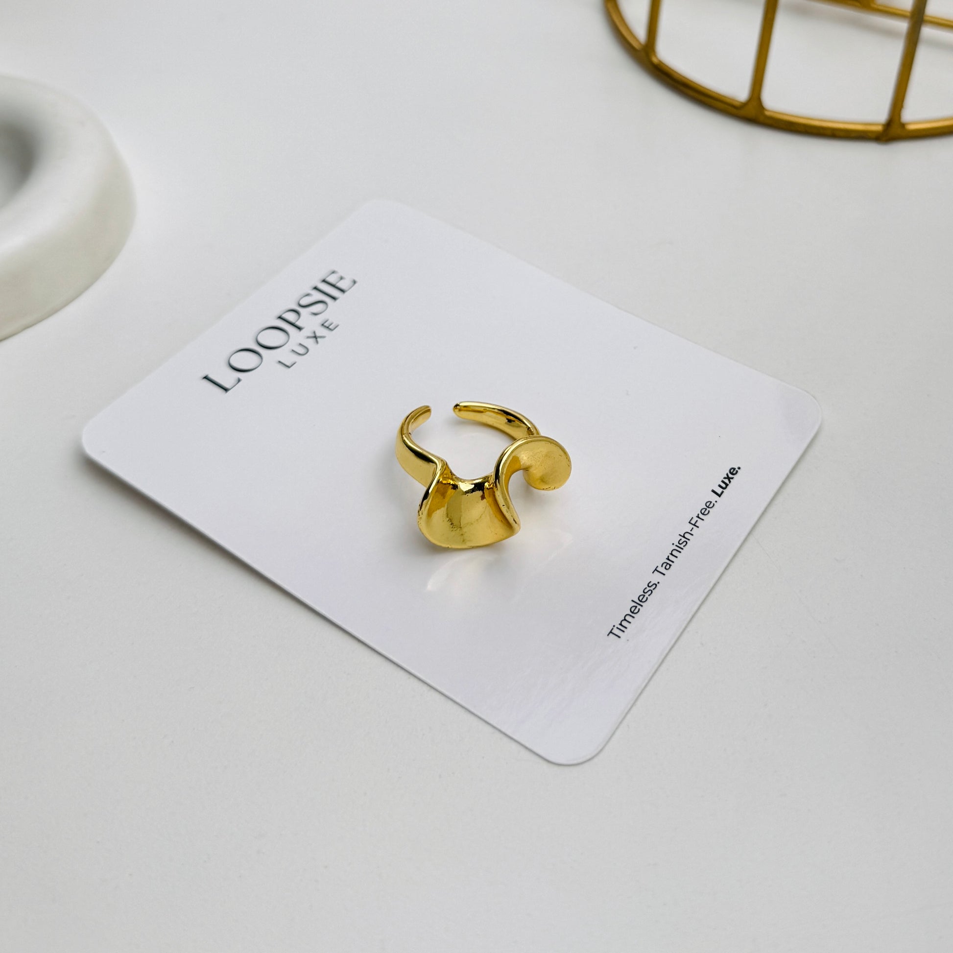 The Serif Curl Ring draws inspiration from calligraphic strokes β fluid, confident, and quietly powerful. Its asymmetric spiral detail mimics the grace of a handwritten flourish, cast in glowing gold.