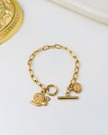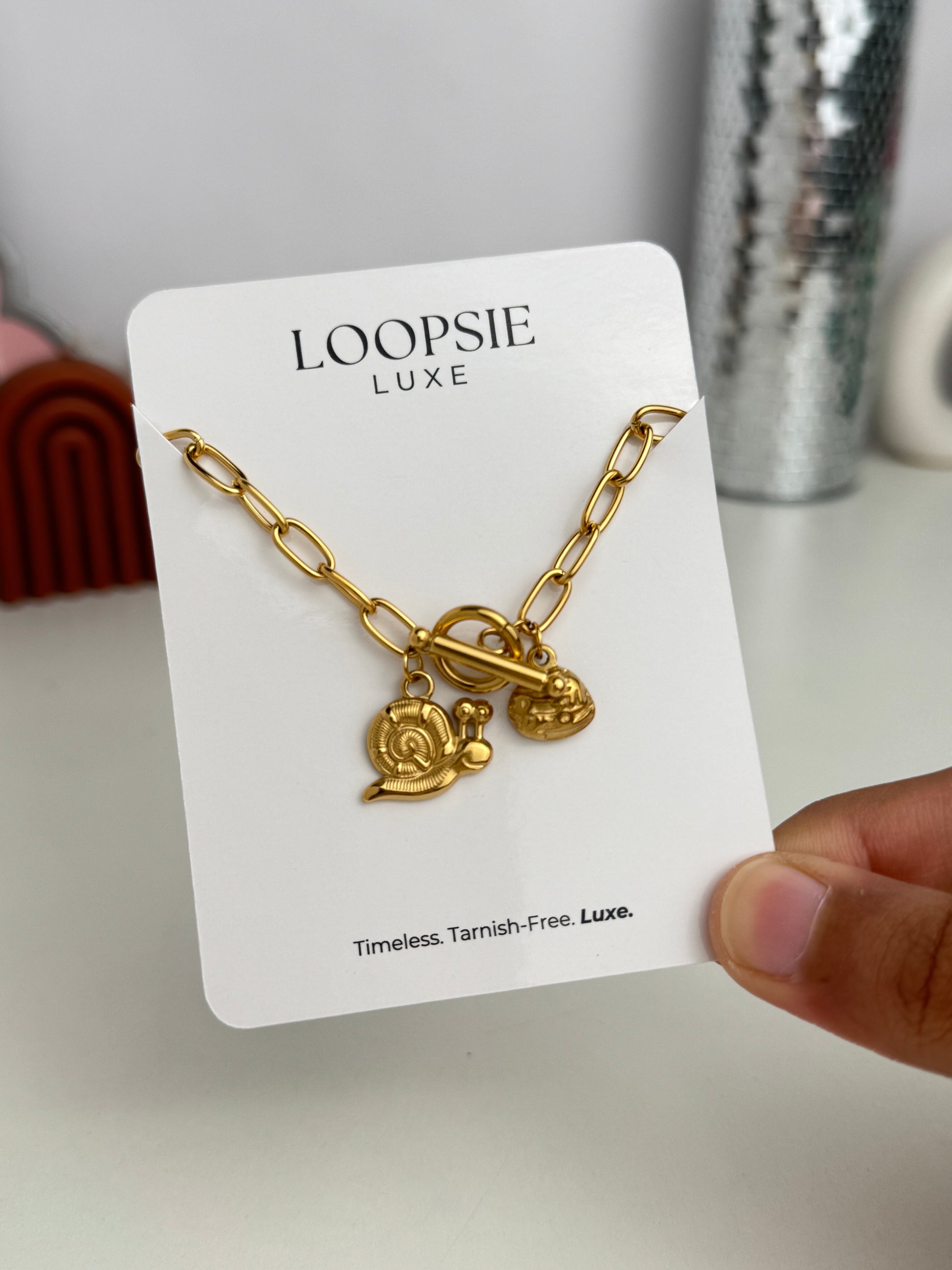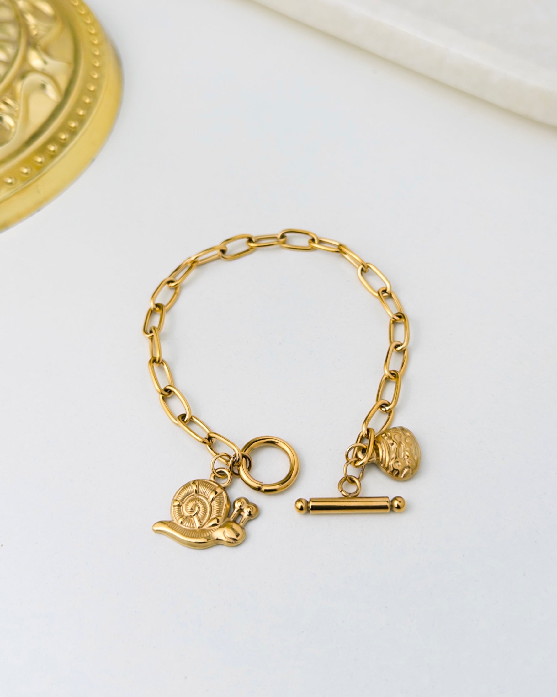 A unique charm bracelet featuring a sculpted snail motif and toggle-style clasp. Designed as a conversation piece with a modern, artistic edge.